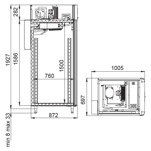 Каталог оборудования Холодильное оборудованиеШкафы холодильныеСпециализированные холодильные шкафыШкаф холодильный для вызревания салями Polair CS107 Salami со стеклом Шкаф холодильный для вызревания салями Polair CS107 Salami со стеклом Код товара: 062-631 Поделиться: WhatsAppTelegram СравнитьДобавить в КПВ избранное 0 385 050 ₽ В корзину 0 шт Под заказСамовывоз сегодня бесплатно Взять в кредит Купить в лизинг Получить консультацию в WhatsApp Описание Характеристики Отзывы 0 Инструкции 5 Шкаф холодильный для вызревания салями Polair CS107 Salami со стеклом предназначен для приготовления и хранения салями, сыровяленых колбас и других мясных деликатесов на предприятиях общественного питания и торговли. Корпус цельнозаливной конструкции выполнен из нержавеющей стали снаружи и внутри (кроме задней стенки), что обеспечивает высокую прочность и долговечность. Дверь выполнена в виде стеклопакета для удобного визуального контроля. Оборудование рассчитано на работу при температуре окружающей среды до +40 °С. Особенности: Динамическое охлаждение с мягким обдувом без заветривания Верхнее расположение агрегата Автоматическая оттайка с системой испарения конденсата Русифицированная многофункциональная панель управления с дисплеем 5" и возможностью создания и сохранения собственных программ Встроенный ультразвуковой увлажнитель (необходима подача очищенной воды и подключение к канализации) UV-лампа для обеззараживания воздуха внутри камеры 3 пары направляющих с тремя перекладинами и подвесами для колбас Регулируемый уровень влажности: от 60 до 95 % Распашная дверь с заливной теплоизоляцией, встроенной ручкой и магнитным уплотнителем Отключаемая внутренняя LED-подсветка Штампованное углубление в дне корпуса для удобства ухода Педаль для удобного открытия двери Хладагент R290 (пропан) Толщина стенки корпуса: 43 мм Polair CS107 Salami со стеклом — это профессиональный шкаф, разработанный специально для мясных деликатесов. Он обеспечивает оптимальные условия для ферментации и хранения продукции за счёт точного контроля температуры и влажности, продуманной конструкции и удобного функционала. Такой шкаф станет надёжным решением для мясных цехов, гастробаров и специализированных магазинов.Изображение товара, представленного на фото, может отличаться от его фактического вида. Показать все Габаритные размеры697×1005×1960 ммДиапазон рабочей температурыот -2 до +30 °CДлина697 ммШирина1005 ммВысота1960 ммОбъём700 лКол-во дверей1 Тип двериСтеклянная Уровень влажностиот 60 до 95 %Холодильный агрегатВстроенный Тип оттайкиАвтоматическая Тип охлажденияДинамическое ПодсветкаЕсть UV-лампаЕсть ХладагентR290 Вес нетто160 кгВес брутто190 кгБрендPolairВсе специализированные холодильные шкафы Из нержавейкиВсе специализированные холодильные шкафы Стеклянная дверь Оставить отзыв Еще никто не оставил отзыв на этот товар Схема POLAIR CS107 Salami.jpgИнструкция на POLAIR CS107 Salami.pdfБрошюра на POLAIR CS107 Salami.pdfДекларация о соответствии.pdfСертификат соответствия.pdf Похожие товары Перейти в каталог Под заказ 399 500 ₽ Шкаф холодильный для вызревания мяса Polair CS107 Meat со стеклом (Тип 1) Под заказ 405 450 ₽ Шкаф холодильный для хлебопекарных производств Polair CS107 Bakery Br черный, со стеклом (Тип 1) Под заказ 207 942 ₽ Шкаф холодильный HURAKAN HKN-MA350 для созревания мяса Под заказ 389 300 ₽ Шкаф холодильный для вызревания сыра Polair CS107 Cheese черный, со стеклом 
