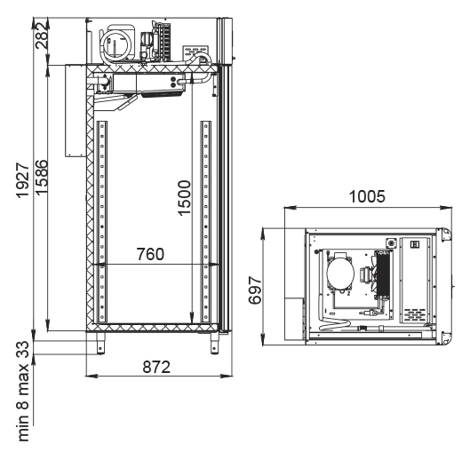 Каталог оборудования Холодильное оборудованиеШкафы холодильныеСпециализированные холодильные шкафыШкаф холодильный для вызревания сыра Polair CS107 Cheese полки нерж., со стеклом Шкаф холодильный для вызревания сыра Polair CS107 Cheese полки нерж., со стеклом Код товара: 062-630 Поделиться: WhatsAppTelegram СравнитьДобавить в КПВ избранное 0 397 800 ₽ В корзину 0 шт Под заказСамовывоз сегодня бесплатно Взять в кредит Купить в лизинг Получить консультацию в WhatsApp Описание Характеристики Отзывы 0 Инструкции 5 Шкаф холодильный для вызревания сыра Polair CS107 Cheese полки нерж., со стеклом предназначен для создания оптимальных условий хранения и дозревания твердых и полутвердых сыров на предприятиях общественного питания и торговли. Монолитный цельнозаливной корпус изготовлен из нержавеющей стали снаружи и изнутри (кроме задней стенки), что обеспечивает высокую прочность и долговечность шкафа. Дверь выполнена из стеклопакета. Оборудование рассчитано на работу при температуре окружающей среды до 40 °С. Особенности: Верхнее расположение агрегата Многофункциональная русифицированная контрольная панель с 5-дюймовым дисплеем Возможность создания и сохранения собственных программ в памяти электронного блока Четыре перфорированные полки из нержавеющей стали Встроенный ультразвуковой увлажнитель (требуется подключение к системе очищенной воды и централизованной канализации) Распашная дверь с заливной теплоизоляцией Заменяемый уплотнитель двери с магнитной вставкой Встроенная ручка для удобства открытия Отключаемая внутренняя LED-подсветка Штампованное углубление в дне корпуса для удобства очистки Педаль для бесконтактного открывания двери Регулировка уровня влажности от 60% до 95% Максимальная нагрузка на полку — 40 кг Толщина стенки корпуса — 43 мм Polair CS107 Cheese полки нерж., со стеклом — надежный и функциональный холодильный шкаф, обеспечивающий оптимальные условия для хранения и дозревания твердых и полутвердых сыров. Благодаря прочному корпусу, точному контролю температуры и влажности, а также современным технологиям увлажнения и управления, оборудование способствует сохранению качества и вкусовых характеристик продукции, повышая эффективность работы предприятий питания и торговли.Изображение товара, представленного на фото, может отличаться от его фактического вида. Показать все Габаритные размеры697×1005×1960 ммДиапазон рабочей температурыот -2 до +30 °CДлина697 ммШирина1005 ммВысота1960 ммОбъём700 лКол-во дверей1 Тип двериСтеклянная Количество полок4 штДопустимая нагрузка на полку40 кгУровень влажностиот 60 до 95 %Холодильный агрегатВстроенный Тип оттайкиАвтоматическая Тип охлажденияДинамическое ПодсветкаЕсть ХладагентR290 Вес нетто160 кгВес брутто190 кгБрендPolairВсе специализированные холодильные шкафы Из нержавейкиВсе специализированные холодильные шкафы Стеклянная дверь Оставить отзыв Еще никто не оставил отзыв на этот товар Схема POLAIR CS107 Cheese.jpgИнструкция на POLAIR CS107 Cheese.pdfБрошюра на POLAIR CS107 Cheese.pdfДекларация о соответствии.pdfСертификат соответствия.pdf Похожие товары Перейти в каталог Под заказ 402 050 ₽ Шкаф холодильный для вызревания мяса Polair CS107 Meat со стеклом (Тип 2) Под заказ 414 545 ₽ Шкаф холодильный для хлебопекарных производств Polair CS107-Bakery Br со стеклом (Тип 1) Под заказ 389 300 ₽ Шкаф холодильный для вызревания мяса Polair CS107 Meat черный, со стеклом (Тип 1) В наличии