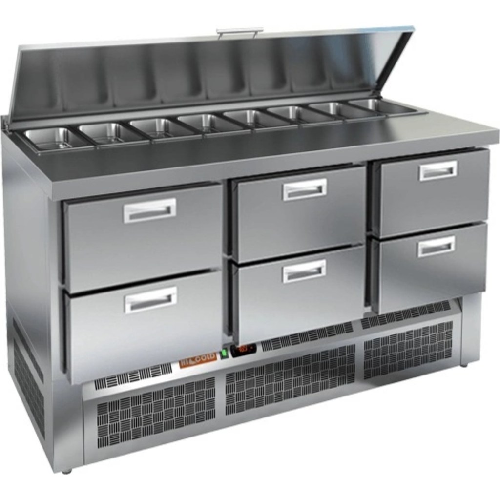 Стол холодильный для салатов HiCold SLE1-222SN (1/3) с крышкой предназначен для использования на предприятиях общественного питания и торговли. Он служит для хранения и обработки ингредиентов, используемых при приготовлении салатов, пиццы, закусок и других блюд. Также стол подходит для охлаждения и кратковременного хранения скоропортящихся продуктов и напитков.