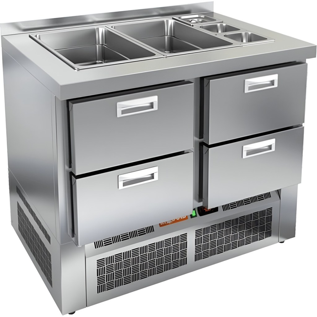 Модель обеспечивает удобный доступ к продуктам и позволяет повару работать максимально эффективно. Корпус и столешница изготовлены из нержавеющей стали, что гарантирует долговечность конструкции, устойчивость к коррозии и соответствие санитарным нормам.