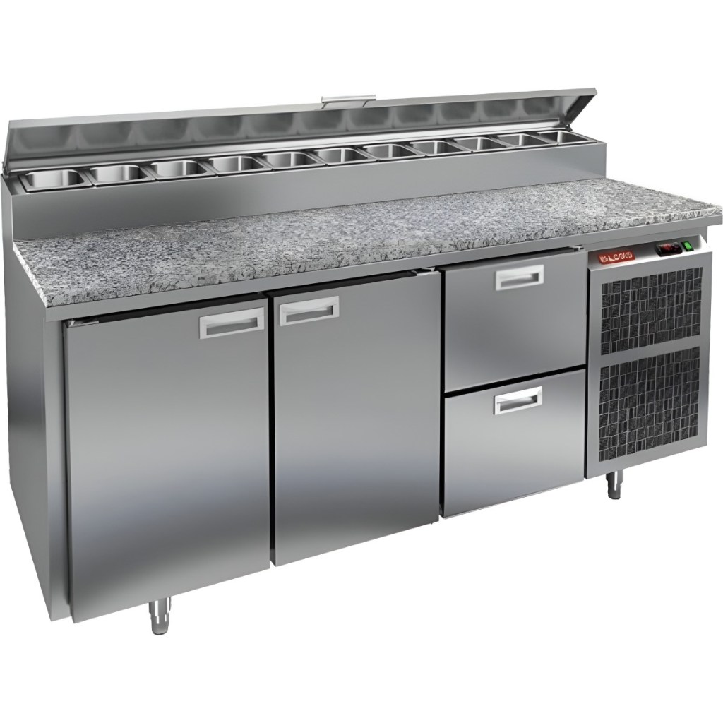 Стол холодильный для пиццы HiCold PZ2-112GN (1/6) камень предназначен для кухонь и предприятий общественного питания. Он используется для раскатки теста, подготовки ингредиентов для пиццы, салатов и других блюд, а также для охлаждения и кратковременного хранения скоропортящихся продуктов. Модель совмещает гранитную рабочую поверхность и охлаждаемый отсек с 2 дверями и 2 ящиками, обеспечивая удобный доступ к ингредиентам и эффективное хранение.
